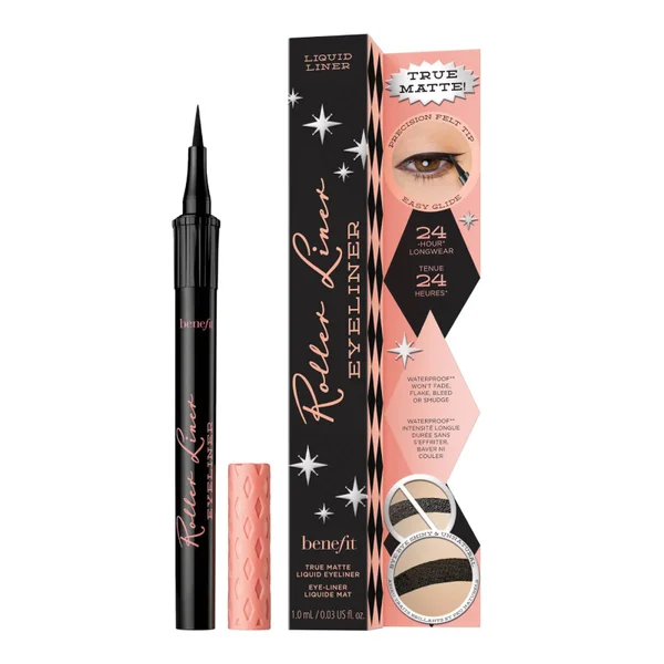 Expertly define your eyes with the benefit Roller Liner; a matte liquid formula to accentuate and enhance with long-wearing results that last up to 24 hours**. Featuring a precision felt tip for mistake-free application, the quick-drying, waterproof* eyeliner glides on effortlessly in one easy sweep to create smooth, continuous lines for a makeup look as dramatic as desired. Achieve a professional cat eye, or draw thin to thick lines with ultimate control. No smudging, flaking or fading.